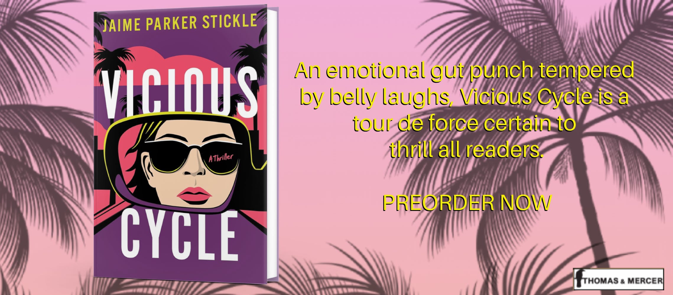 Vicious Cycle is being published by Thomas & Mercer and will debut in like 6 weeks, October 21! It’s a crime/thriller story that I wrote in the cracks of my life—many early mornings, late-late nights, lunch breaks, and every Saturday and Sunday. And it took years, because a debut does take years. It’s not just getting to an agent and to publishing—it’s getting to perfection…which we all know doesn’t exist, but writers will try.